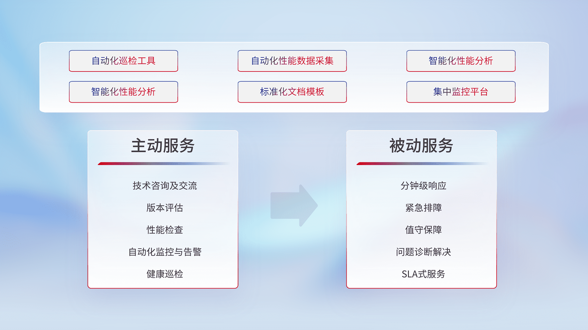 智能化工具和标准化文档,,,保障服务质量,,,提供主动服务(包含技术咨询、、、版本评估、、、、性能检查、、、、自动化监控与告警、、健康巡检)和被动服务包含(分钟级响应、、、、紧急排障、、、值守保障、、、、问题诊断解决、、、、SLA服务)。。。。